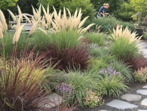 Trawy ozdobne, jak miskanty czy rozplenice, świetnie sprawdzają się jako tło dla barwnych kwiatów. Ich delikatne ruchy na wietrze nadają aranżacji dynamiki i naturalnego charakteru. Ciekawy kontrast można osiągnąć poprzez zestawienie pastelowych tonacji z bardziej nasyconymi kolorami – na przykład różowe hortensje pięknie współgrają z białymi jeżówkami i fioletową lawendą.